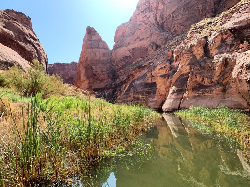 West canyon went pretty far back and we were able to boat through the cat tails. The water level seemed optimal to get to the back of West Canyon and hike. Face Canyon was quite impressive and very accessible. We were able to cruise back through the maze of slots/canyons in the boat with very little room to spare. West and Face canyon had more limited camp sites due to beaches being under water.