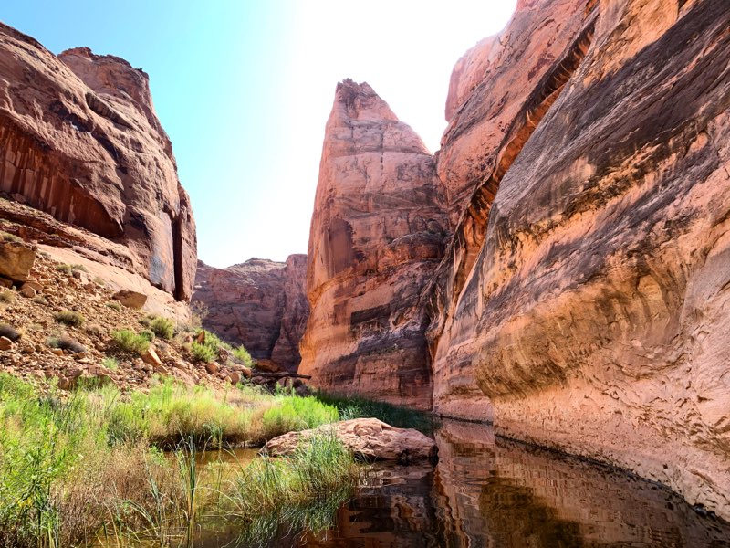 West canyon went pretty far back and we were able to boat through the cat tails. The water level seemed optimal to get to the back of West Canyon and hike. Face Canyon was quite impressive and very accessible. We were able to cruise back through the maze of slots/canyons in the boat with very little room to spare. West and Face canyon had more limited camp sites due to beaches being under water.